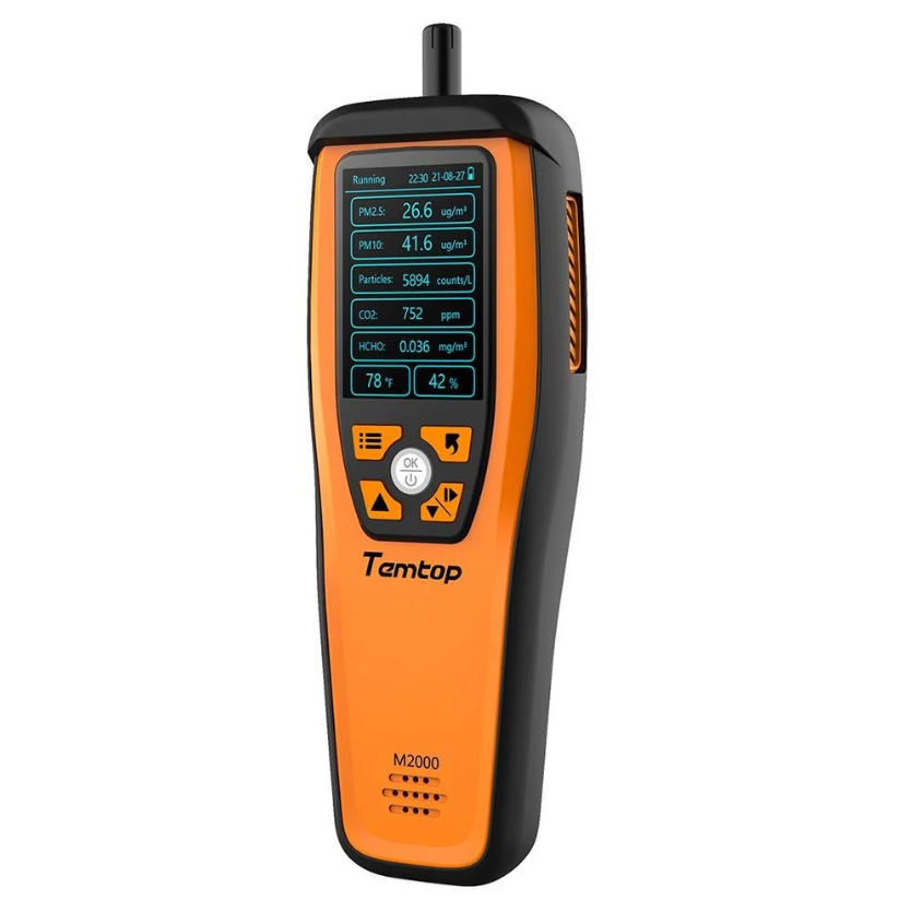 La unidad de sensor Elitech Temtop M2000 de segunda generación proporciona mediciones en tiempo real de concentraciones de masa de PM 2,5 y PM 10 , formaldehído y dióxido de carbono. También muestra la temperatura y la humedad relativa en la pantalla LCD. Cuenta con una función de histograma para mostrar los cambios en la concentración de PM 2,5 en las últimas 12 horas.