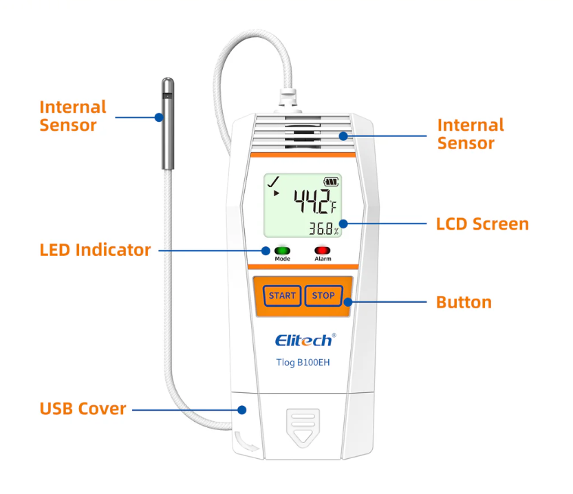 Elitech Tlog B100EH cuenta con un puerto USB, una pantalla LCD y dos botones diseñados para evitar toques accidentales. Puede ver el estado y los parámetros del dispositivo presionando un botón o personalizar varios parámetros, como los modos de inicio/detención, umbrales múltiples y modos de almacenamiento. También puede ver un informe en PDF generado automáticamente sin usar el software ElitechLog.