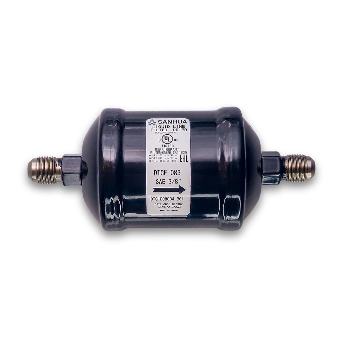 El filtro deshidratador - filtro secador El DTGE 083 es un componente de bloque sólido de 8 pulgadas cúbicas diseñado para proporcionar una protección máxima en sistemas de refrigeración y aire acondicionado comerciales. Este modelo destaca por su conexión de 3/8 pulgadas Flare (a rosca o roscable), que permite una instalación y reemplazo sumamente ágil sin necesidad de utilizar soplete, siendo la solución ideal para mantenimientos rápidos en equipos que requieren una intervención limpia y eficiente.