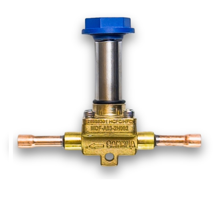 La Válvula Solenoide Sanhua, modelo MDF-A03-2H002, es una válvula de acción directa, normalmente cerrada (NC), diseñada para aplicaciones de refrigeración, aire acondicionado y bombas de calor de pequeña capacidad, los modelos de la serie MDF-A03-2H con terminación 002 corresponden a conexión ODF de 6 mm (métrica) , ideal para líneas de líquido y succión en sistemas compactos que utilizan tubería métrica. Su construcción robusta en latón forjado y su diseño compacto permiten una operación fiable en un amplio rango de temperaturas y presiones.