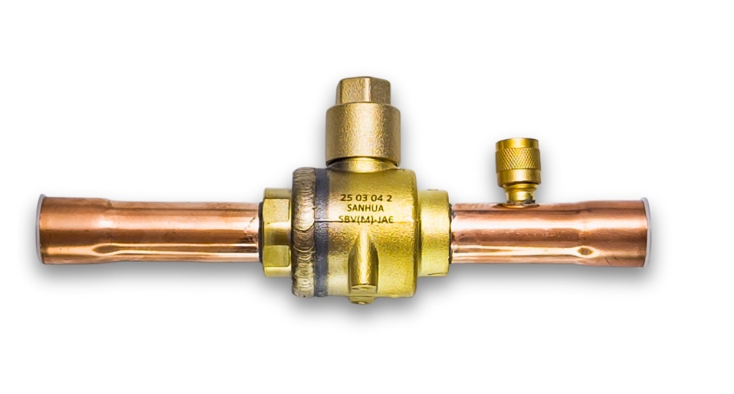La Válvula de Bola con Acceso para Servicio Sanhua, modelo SBV(M)-JA6YHSY-1-S, es un componente industrial de alta capacidad perteneciente a la serie SBV(M) de Sanhua. Según el catálogo oficial, este modelo está diseñado con conexiones ODF de 3/4" (19,05 mm) para soldar, proporcionando un caudal significativo para sistemas de refrigeración y aire acondicionado de escala comercial grande e industrial. Su construcción de pasaje completo (full port) minimiza la caída de presión, mientras que la válvula de servicio (Schrader) integrada permite realizar operaciones de mantenimiento, vacío y carga de refrigerante de manera eficiente y segura, sin necesidad de instalar puertos adicionales en la línea.