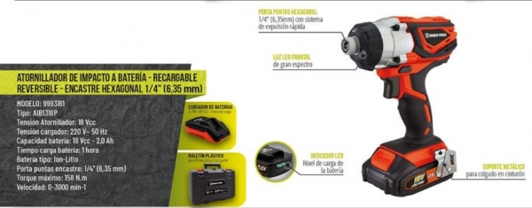 REVERSIBLE ENCASTRE HEXAGONAL 1/4“³ (6,35MM) Tension Atornillador: 18Vcc Capacidad bateria: 18Vcc ““ 2,0 Ah Tension Cargador: 220V ““ 50Hz Tiempo Carga Bateria: 1 Hr Bateria Tipo: Ion-Litio Porta puntas Encastre: 1/4“³ (6,35mm) Torque Max: 158 Nm Velocidad variable: 0 ““ 3000 min-1