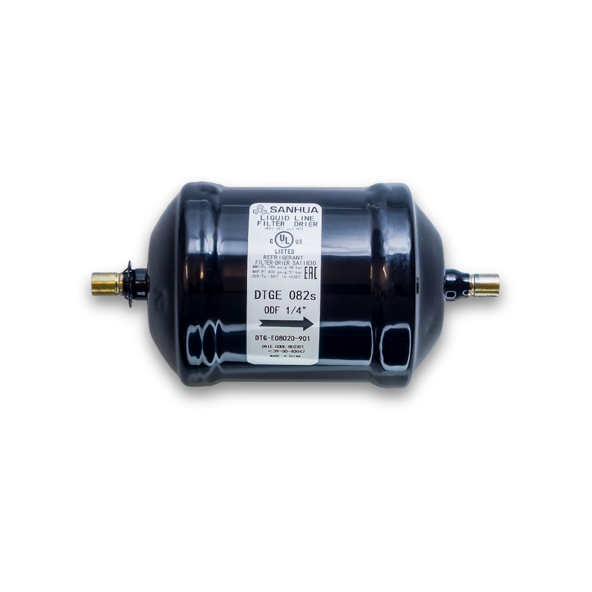El filtro deshidratador - filtro secador El DTGE082S es un componente de bloque sólido de 8 pulgadas cúbicas diseñado para brindar una protección integral en sistemas de refrigeración y aire acondicionado. Este modelo cuenta con conexión de 1/4 pulgadas ODF (para soldar), lo que garantiza una instalación hermética y definitiva, eliminando riesgos de fugas por vibración en equipos comerciales e industriales de media potencia.