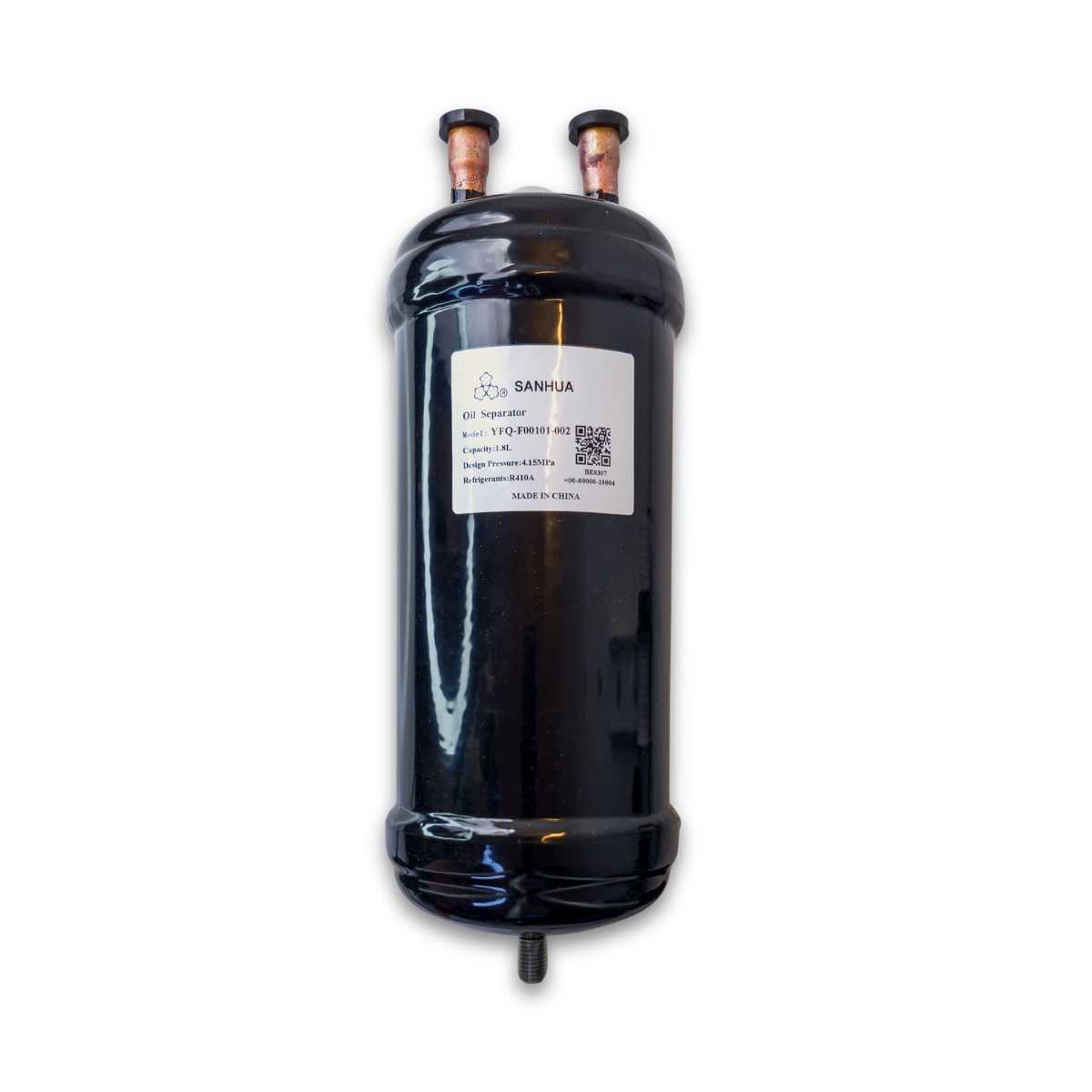 El separador de aceite Sanhua YFQ-F00101-002 está diseñado para su instalación en la línea de descarga de compresores que trabajan con R410A, refrigerante de alta presión. Su volumen interno de 1.8 L lo hace apto para sistemas de aire acondicionado y refrigeración de capacidad media. Con una presión máxima de 4,15 MPa (41,5 bar) y un rango de operación de –30 °C a +120 °C, asegura un retorno eficiente del aceite al cárter del compresor, alcanzando más del 90 % de eficiencia de separación. Su construcción en acero con recubrimiento anticorrosivo le da larga vida útil, incluso en condiciones exigentes.