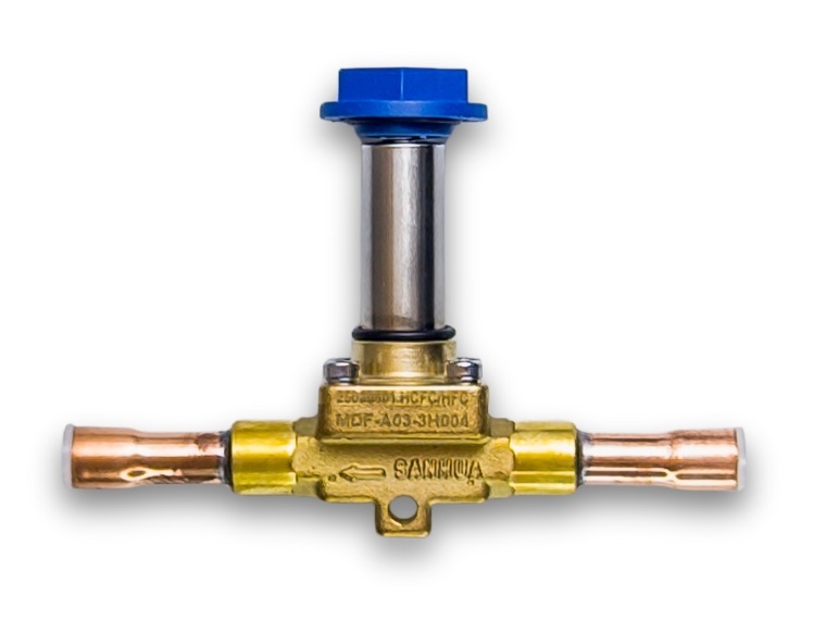 La válvula solenoide Sanhua MDF-A03-3H004 pertenece a la serie MDF de válvulas para refrigeración, destinada a controlar el flujo de refrigerante en sistemas de aire acondicionado, bombas de calor y refrigeración. Esta variante en particular (“3H004”) se caracteriza por un tamaño y caudal específico (aproximadamente 0,23 m³/h de Kv) y una construcción robusta apta para altas presiones (hasta ~4,5 MPa). Es del tipo normalmente cerrada (NC), lo que significa que con bobina sin alimentación permanece cerrada y se abre al aplicar corriente. Está diseñada para su uso con los refrigerantes habituales como HCFC, HFC y mezclas modernas, con amplio rango de temperatura de servicio. Su instalación puede realizarse en líneas de líquido, succión o descarga, respetando la flecha de flujo marcada y con la bobina preferiblemente hacia arriba.